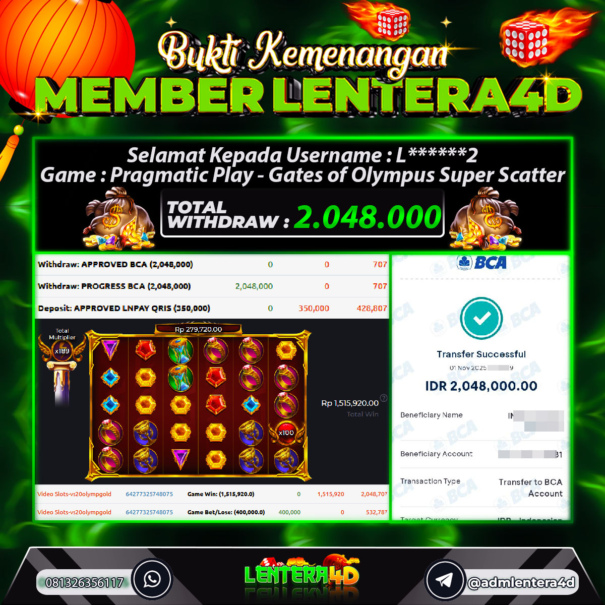 Selamat Kepada Member Yang Berhasil Mendapatkan Jackpot Dipermainan Slot Pragmatic Play Hari Ini, Berikut Bukti SS Jackpot Member Di Situs LENTERA4D