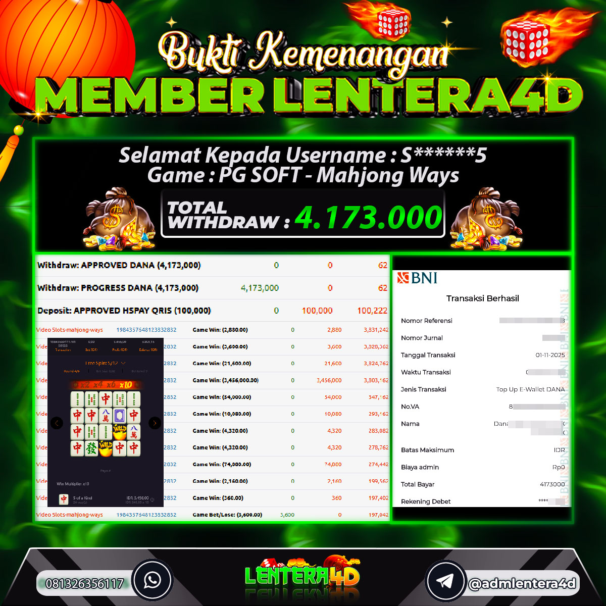 Setiap hari, member Lentera4D berhasil meraih jackpot besar dari berbagai provider slot ternama yang kami sediakan, seperti Pragmatic Play, Habanero, PG Soft, dan masih banyak lagi. Kami secara rutin menampilkan bukti screenshot atau rekapan kemenangan yang berhasil diraih, mulai dari kemenangan ratusan ribu hingga puluhan juta rupiah. Semua slip kemenangan ini kami hadirkan untuk membuktikan bahwa di Lentera4D, peluang menang itu nyata.